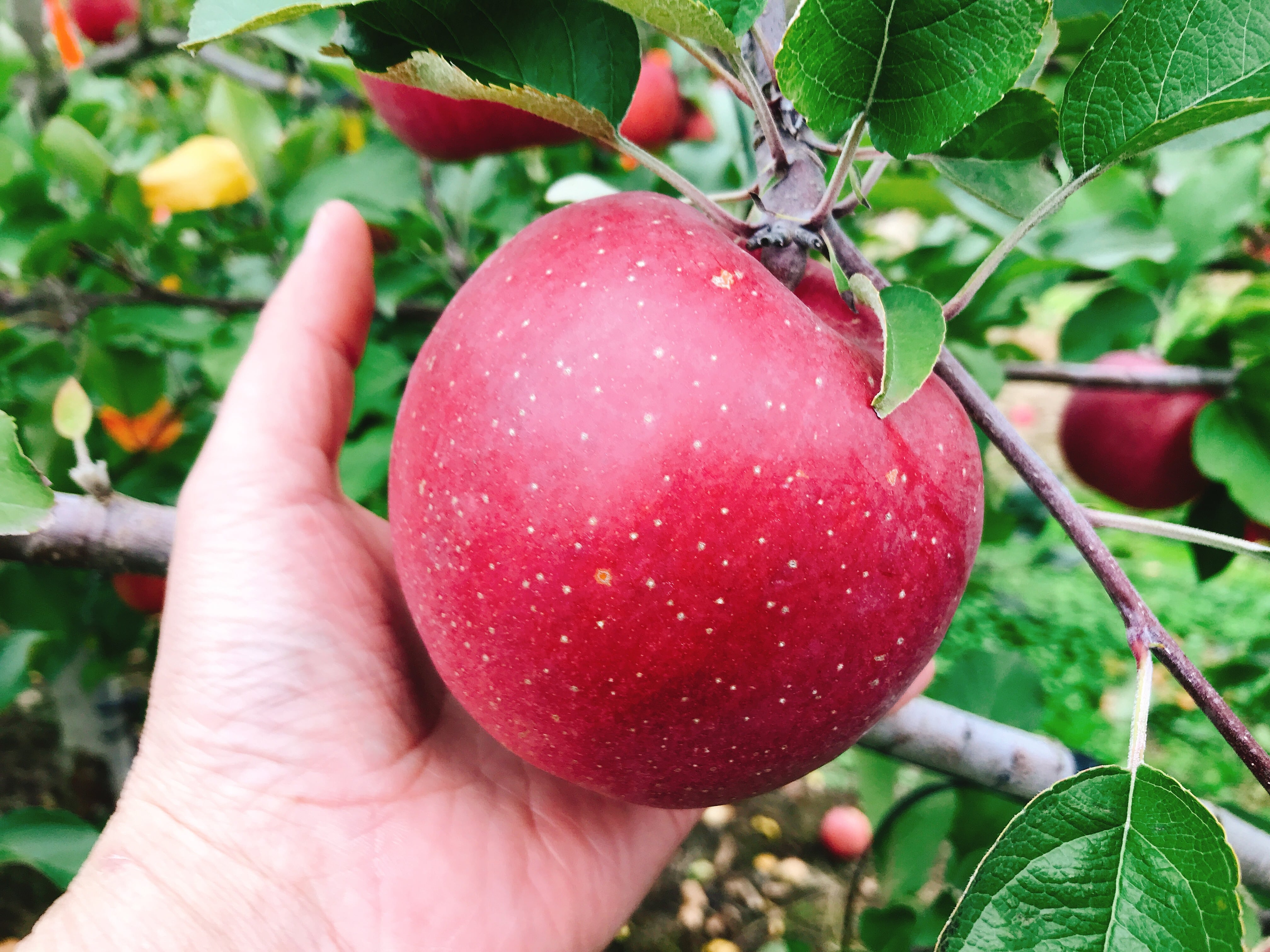 完全無袋で太陽の日差しをふんだんに浴びて育ったリンゴは、色づきも良く糖度も抜群。